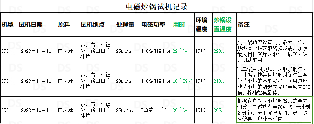 今天是2023年10月11日,今天早上我們的新型550電磁炒貨機(jī)在滎陽(yáng)市王村鎮(zhèn)汝南路口口香油坊進(jìn)行了測(cè)試試用,測(cè)試物料為白芝麻,用戶(hù)壓榨香油用。用戶(hù)油坊內(nèi)現(xiàn)有的電磁炒貨機(jī)每鍋可裝芝麻160斤,電磁功率跟我們相同為20千瓦,炒50斤芝麻冷鍋情況下需要32分鐘左右。我們的炒貨機(jī)冷鍋情況下50斤芝麻用時(shí)22分鐘(根據(jù)實(shí)際情況20分鐘即可炒好),今天測(cè)試了三鍋,平均每鍋用時(shí)20分鐘左右,用戶(hù)對(duì)我們的炒料效果和效率非常滿(mǎn)意。詳細(xì)測(cè)試數(shù)據(jù)我列了個(gè)表,大家可以看下。